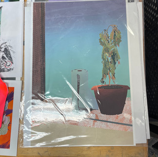 Durant la visite, Jacinthe Loranger a présenté plusieurs de ses œuvres réalisées avec différents médiums. Deux d’entre elles ont particulièrement retenu mon attention dont celle en sérigraphie venant de la série d’installation sérigraphique intitulée « On se revoit dans l'oubli ». Cette série est constituée de tableaux et d’une sculpture. L’artiste a voulu aborder le thème des animaux, plus particulièrement de la chasse des animaux. Elle a recréé des scènes provocantes où on retrouvait des animaux morts, dévorés par leurs prédateurs. Le caractère à la fois sensible et violent du propos contrastait avec le rendu esthétique des œuvres de Jacinthe Loranger. L’artiste a également fabriqué une affiche très large sur laquelle elle a imprimé des objets qu’elle avait préalablement numérisés. Cette œuvre a été installée dans un cégep, c’est pourquoi on pouvait voir divers éléments faisant partie du quotidien des étudiants. Loranger a mis beaucoup d’emphase dans les textures et les motifs qui sont intégrés dans ses impressions, ce qui rendait l’œuvre très dynamique.