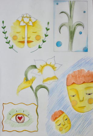 Tout d'abord, j'ai voulu ajouter une touche personnelle pour cette production. Je me suis donc servi de mon prénom vietnamien signifiant « Narcisse » en français afin d'avoir une idée de départ. Par la suite, j'ai repris le mythe de Narcisse comme sujet pour mon dessin. J'ai essayé de le représenter le plus clairement possible à travers des éléments évidents comme la fleur de narcisse, le personnage principal, le reflet qui évoque le narcissisme, etc. En ce qui concerne de la production, je me suis lancée dans un nouveau style dessin que je n'ai jamais adopté auparavant. Donc, un style moins conventionnel et plus simple, donnant un aspect aérien à la composition. J'ai choisi les crayons de bois pour la couleur, car je sentais que c'était le meilleur choix pour travailler sur le vellum selon moi.