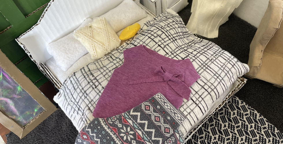 Pour moi, le lit est l'objet qui ressorte le plus dans toute la maquette, car je trouve que mes efforts dans le travail de la couture ont porté fruit pour ce projet. Il y a aussi la chaise d'appoint dont je suis assez fière puisqu'il s'agit également d'un objet que j'ai mis beaucoup de temps pour reproduire (le découpage de la force de chaque pièce, le collage pièce par pièce pour créer l'épaisseur, la couverture avec du tissu, etc.) Par contre, je trouve que le résultat du découpage des éléments faits en carton brun n'est pas encore « esthétique » si on observe de proche. Les fenêtres ont pu été améliorées en ajoutant un cadrage autour. Les recoins où il était plus difficile à couvrir avec de la peinture montrent bien le type de matériaux choisi (les trous de l'épaisseur du carton brun, par exemple). Bref, les traces d'erreur laissées sur un projet d'art reflète l'imperfection qui constitue l'humain, il y a toujours des éléments qui peuvent toujours être améliorés! :)
