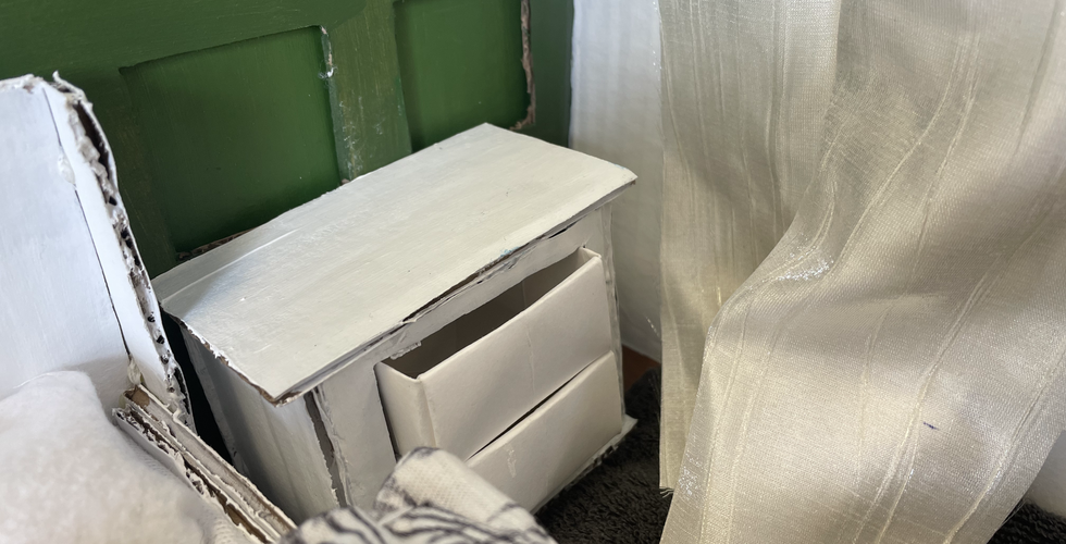 Durant le processus de création, j'ai trouvé le découpage du carton assez difficile. « L'inexpérience » dans la maitrise de l'exacto et la rigidité du carton brun sont les raisons pour lesquelles il était difficile pour moi de bien couper proprement en ligne droite ou en courbe même si j'avais préalablement tracé le contour de la forme voulue. Les tiroirs de la table de chevet ont été un peu difficile à réaliser, aussi pour la rigidité du type de matériaux, mais également parce que ça faisait longtemps que je ne me suis pas remise dans la pratique de l'origami. Toutefois, la couture des rideaux et des éléments du lit ainsi que la peinture ont été des étapes dans lesquelles j'ai eu le plus de facilité et beaucoup de plaisir à réaliser.