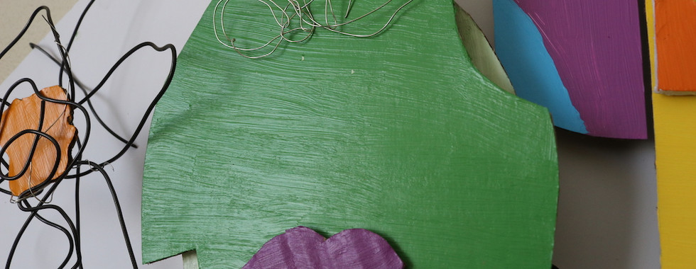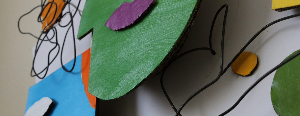Dans l'ensemble, j'ai choisi les couleurs en fonction de leur symbolique et je les ai transposées de façon simple et uniforme vu que l'oeuvre est principalement abstraite. Tout d'abord, le visage vert aux lèvres violettes représente l'idéal de beauté. C'est pourquoi il est mis au centre et orné d'une couronne (fil de métal mince). D'ailleurs, le vert du visage symbolise la chance et le violet des lèvres, le rêve. En définitive, l'idée derrière est de critiquer le fait qu'une personne physiquement belle devient toujours le centre de l'attention dans une société, méritant ainsi le respect de tous, et qu'elle est chanceuse d'avoir ses traits physiques afin de représenter le modèle et le rêve que tout le monde convoite.